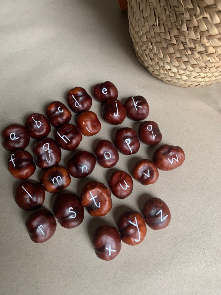 Nasbírané kaštany mohou být pomocníky při učení abecedy. Bílým lihovým fixem na ně s dětmi napište písmenka a s s těmi většími si nechávejte doma třeba krátké kaštánkové vzkazy ?.
