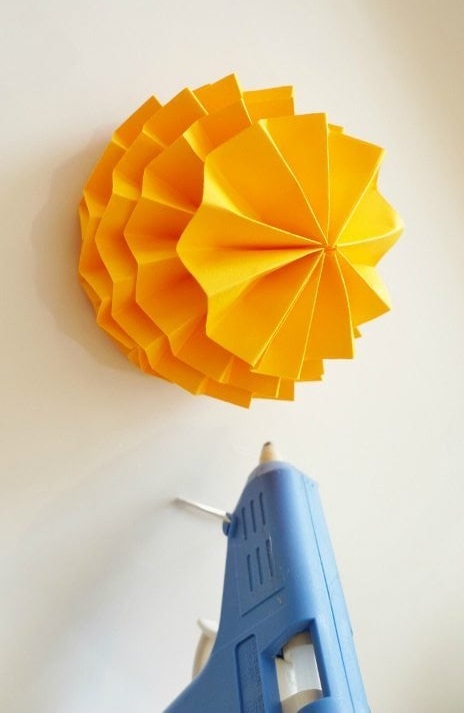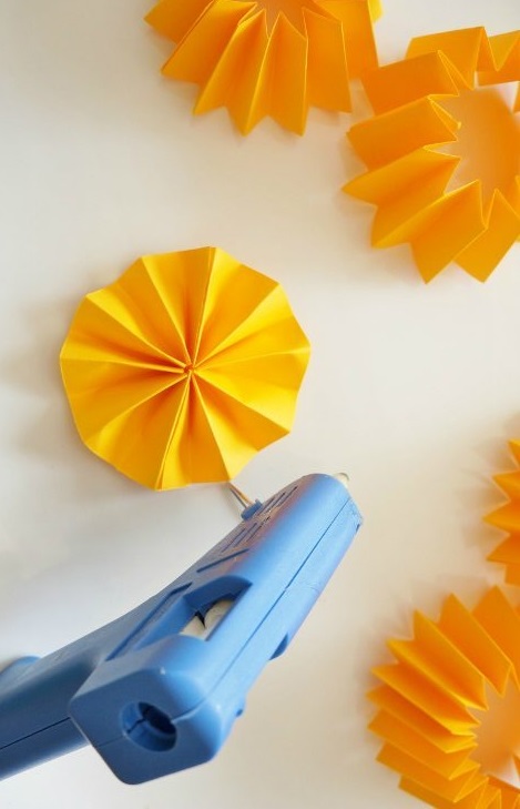 Každý proužek poté složte na harmoniku. Proužky stejných délek slepte k sobě oboustrannou páskou do tvaru rozetky. Dvě rozetky z proužků o délce 9 cm a dvě rozetky z proužků o délce 11 cm. Zbývá jedna rozeta z proužků o délce 7 cm, kterou slepíte v jejím středu tavnou pistolí. Ponechte uprostřed jen malou dírku, ke které se později přilepí kus provázku. Vytvořené rozetky vkládáme do sebe a lepíme jednu ke druhé - od nejmenší po největší do první poloviny papírové dýně, od největší po nejmenší od druhé její poloviny. Jako poslední krok přilepte kousek provázku a dva zelené lístky.