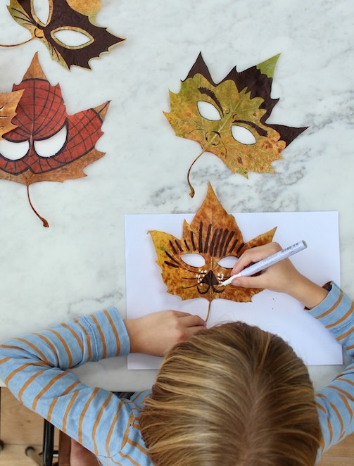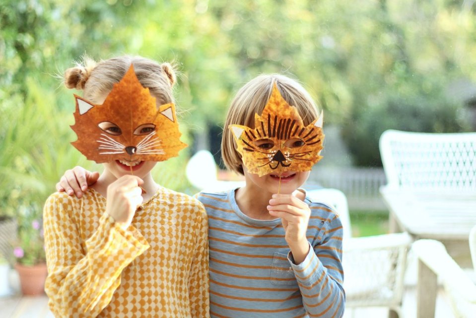 Masky z javorového listí. Krásné i jen jako dekorace do dětského pokojíčku. Nalepte velký javorový list na čtvrtku papíru, po zaschnutí lepidla list vystřihněte i s otvory pro oči. Vaše děti si na něj pak pomocí fixů domalují tvář jakéhokoliv zvířátka, které je napadne. Nebo klidně i tvář oblíbeného superhrdiny ?.