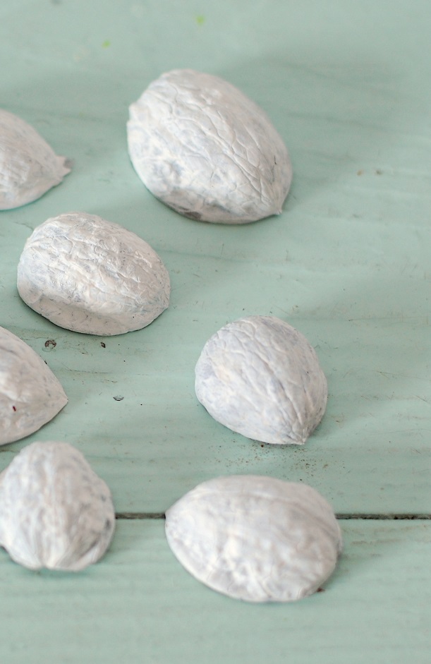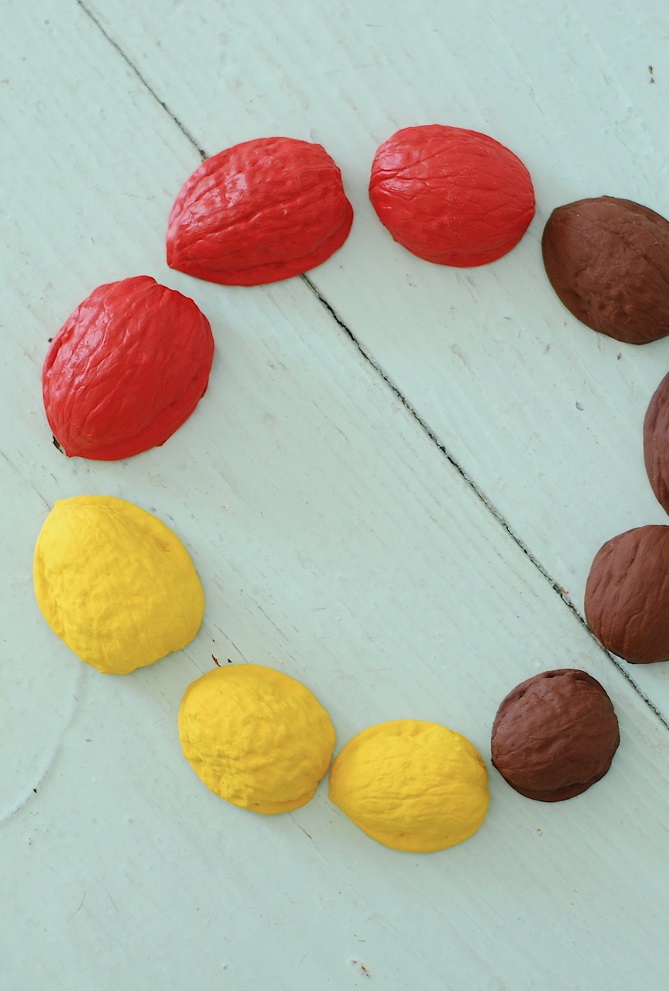 Budete potřebovat skořápky ořechů, temperové barvy a štětce.