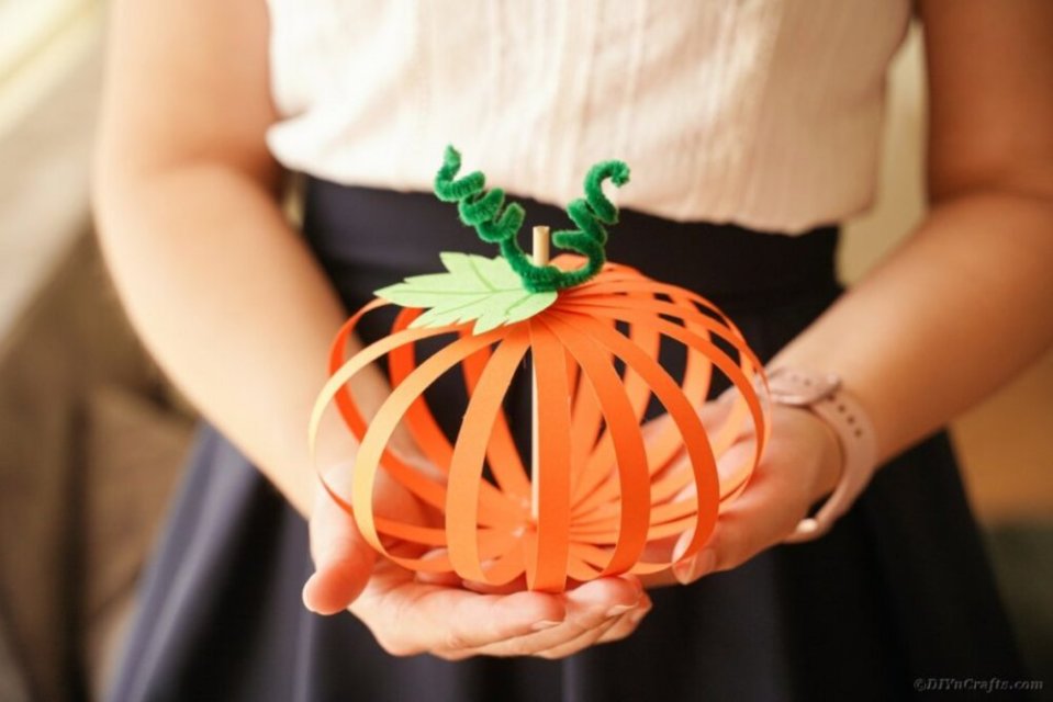 Ještě jednodušší papírové dýně vytvoříte pomocí stejně dlouhých a širokých proužků z barevné čtvrtky. Délka a šířka proužků je jen na Vás, záleží, jak velkou papírovou dýni chcete.
