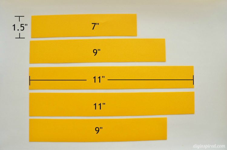 Na každou dýni potřebujete dvě čtvrtky o velikosti 8,5x11 cm. Čtvrtky po jejich délce nastříhejte na proužky široké 1,5 cm. Takto si připravte 1 proužek o délce 7cm, dva proužky o délce 9cm a zbývající dva o délce 11 cm. Nezapomeňte, že na každou dýni je třeba mít tuto sadu proužků dvakrát.